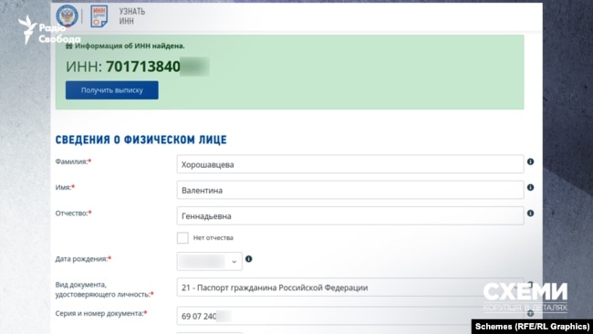 «Схеми» з’ясували, що Хорошавцева є племінницею судді Стефанів та громадянкою Російської Федерації – там народилася та постійно мешкає, про що свідчать численні витоки з баз даних громадян РФ. Також дані її чинного російського паспорту обліковує російська Федеральна податкова служба.