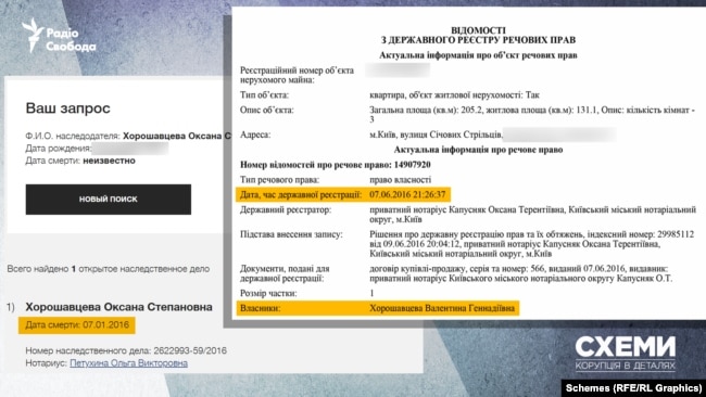 Зокрема, таке: сестра судді Оксана Хорошавцева померла 7 січня 2016 року – про що свідчать дані нотаріальної палати РФ про відкриття спадкової справи – а київську квартиру, де мешкає Стефанів, племінниця судді придбала 7 червня 2016 року, тобто майже пів року по тому. Це суперечить твердженню Стефанів про те, що її родичі скасували переїзд з Росії до Києва саме через смерть її сестри.